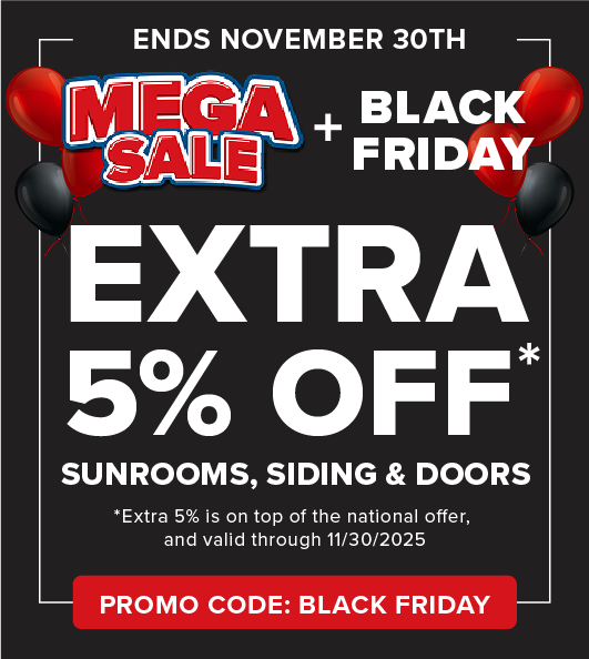 *Buy 2 Comfort 365 Windows® at regular price and get 2 additional windows of equal or lesser value free with participation in the Yes! Program. Offer applies to all window styles in white except nonrectangular shaped window styles, standard installation included. Window discount without participation in Yes! Program equals 40% off. Minimum purchase of 4 windows required. 20% national sunroom, siding, door and roofing discount requires minimum purchase of 120 sq. ft. complete sunroom, 1,200 sq. ft. of siding, 1 entry door with decorative glass or 20 squares of roofing. Earn up to an additional 10% off with participation in the Yes! Program (up to $2,000), making your sunroom, siding, and entry door discount a total of up to 30% off. Black Friday extra 5% off is on top of the national sunroom, siding, door, and roofing offer. All discounts apply to the MSRP cost. No adjustments can be made on prior sales. YES! Program valid only at the time of your initial demonstration and once per residence per term. Offer subject to change. †The Champion Limited Lifetime Warranty applies to Comfort 365 Windows® and qualifying Champion products as long as the original purchaser owns the home. See website or a Champion representative for details. Offer expires 11/30/25. ©Champion Opco LLC, 2025